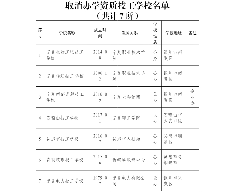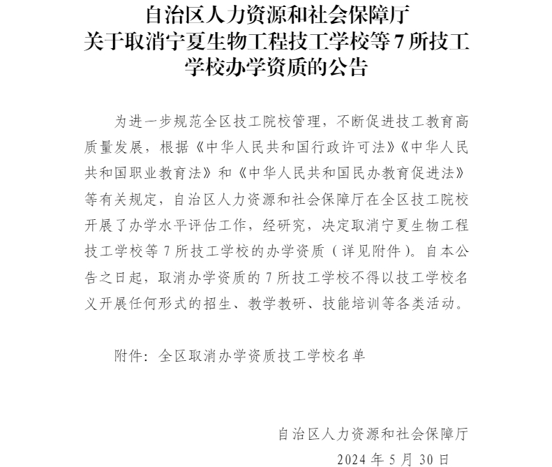據了解,為進一步規范全區技工院校管理,不斷促進技工教育高質量發展,根據《中華人民共和國行政許可法》《中華人民共和國職業教育法》和《中華人民共和國民辦教育促進法》等有關規定,寧夏回族自治區人力資源和社會保障廳在全區技工院校開展了辦學水平評估工作,經研究,決定取消寧夏生物工程技工學校、寧夏輕紡技工學校、寧夏西部光彩技工學校、石嘴山市技工學校、吳忠市技工學校、青銅峽市技工學校、寧夏電力技工學校等7所技工學校的辦學資質,取消辦學資質的學校不得以技工學校名義開展任何形式的招生、教學教研、技能培訓等各類活動。