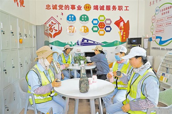 張艷霞家在中衛高鐵南站附近,2019年應聘成為附近片區的清潔工?!斑@里的變化太大了!剛來時我們吃飯、喝水、休息沒有去處,要從家里背兩大瓶水,飯菜也吃不上熱乎的?,F在到了驛站什么都有,可以休息、喝水、拉家常,像家一樣溫暖?!睆埰G霞感嘆。