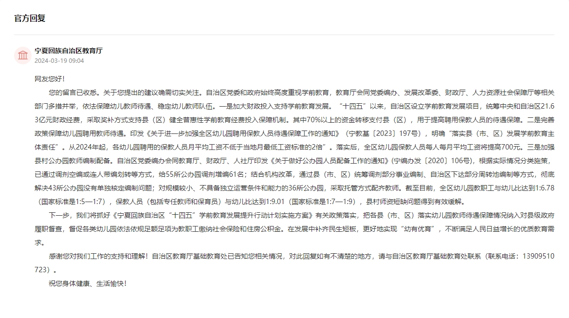 收到留言后,寧夏回族自治區教育廳作出公開回復?;貜头Q,自治區黨委和政府始終高度重視學前教育,教育廳會同黨委編辦、發展改革委、財政廳、人力資源社會保障廳等相關部門多措并舉,依法保障幼兒教師待遇、穩定幼兒教師隊伍。