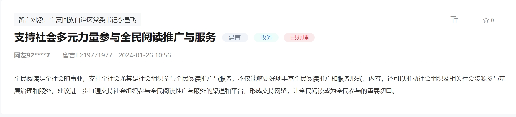 人民網銀川7月6日電(李甜甜)日前,有寧夏網友在人民網“領導留言板”上留言,建議進一步打通支持社會組織參與全民閱讀推廣與服務的渠道和平臺,形成支持網絡,讓全民閱讀成為全民參與的重要切口。