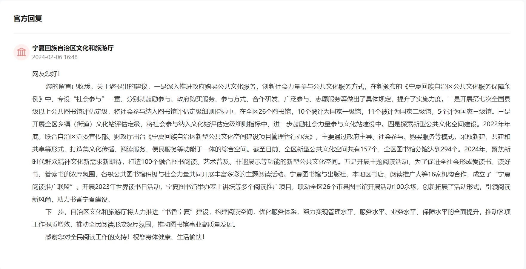 收到留言后,寧夏回族自治區文化和旅游廳作出公開回復?;貜头Q,一是深入推進政府購買公共文化服務,創新社會力量參與公共文化服務方式,在新頒布的《寧夏回族自治區公共文化服務保障條例》中,專設“社會參與”一章,分別就鼓勵參與、政府購買服務、參與方式、合作研發、廣泛參與、志愿服務等做出了具體規定,提升了實施力度。