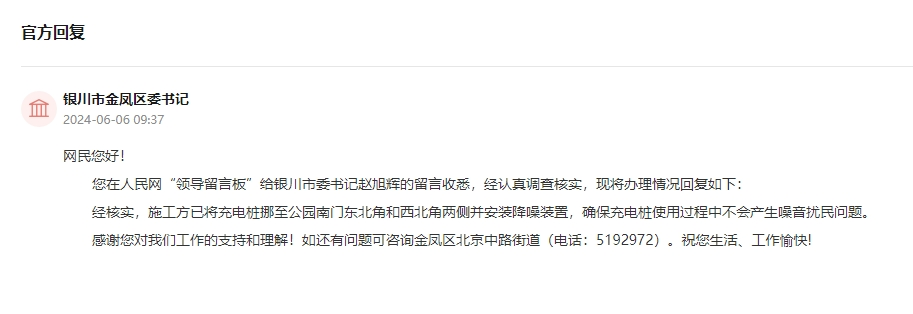 收到留言后,銀川市金鳳區作出公開回復?;貜头Q,經核實,施工方已將充電樁挪至公園南門東北角和西北角兩側并安裝降噪裝置,確保充電樁使用過程中不會產生噪音擾民問題。