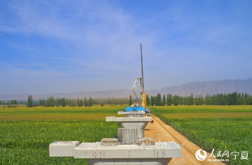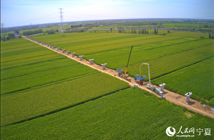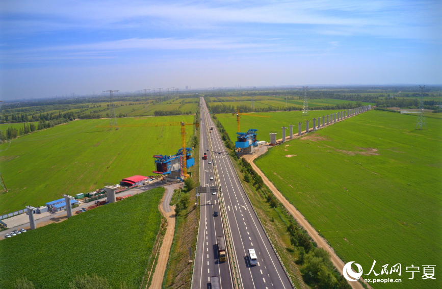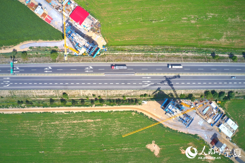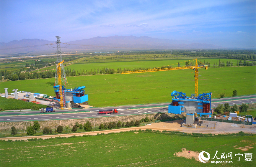 航拍包銀高鐵銀巴支線寧夏段橫跨烏瑪高速施工現場。人民網記者 梁宏鑫攝