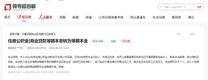 該網友上網查詢得知,目前多地已開通還款方式在等額本息與等額本金之間互轉的業務,借款人可自主申請更換等額本息和等額本金還款方式(包括已發放貸款),希望寧夏相關部門也可以開展此項工作,解決全區各位職工還貸壓力。