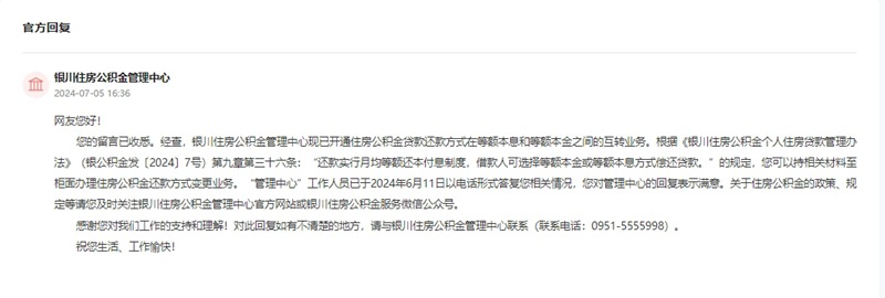 收到留言后,銀川住房公積金管理中心作出公開回復?;貜头Q:經查,銀川住房公積金管理中心現已開通住房公積金貸款還款方式在等額本息和等額本金之間的互轉業務。網友可以持相關材料至柜面辦理住房公積金還款方式變更業務。