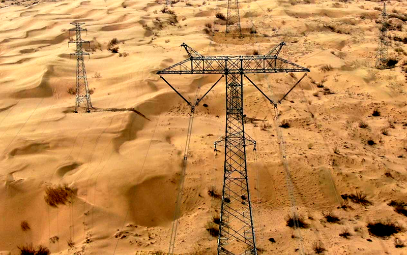 銀東直流(寧夏寧東-山東青島)是世界首條±660千伏直流輸電工程,2011年正式投運以來,已有超3300億度的“風光火”電從寧夏“打捆”送往山東,承擔著推動東西兩地經濟、社會發展。然而在過程中,部分地區的生態環境給電網運維帶來了不少隱患。銀東直流輸電線路寧夏段有20%的電力鐵塔位于沙漠地帶。由于植被覆蓋率低,大風、沙塵暴等特殊天氣加速了水土流失,惡劣環境不僅造成了鐵塔塔基侵蝕、電纜表面沖蝕、運維檢修難度大等問題隱患,也對當地群眾的生產生活造成不便。
