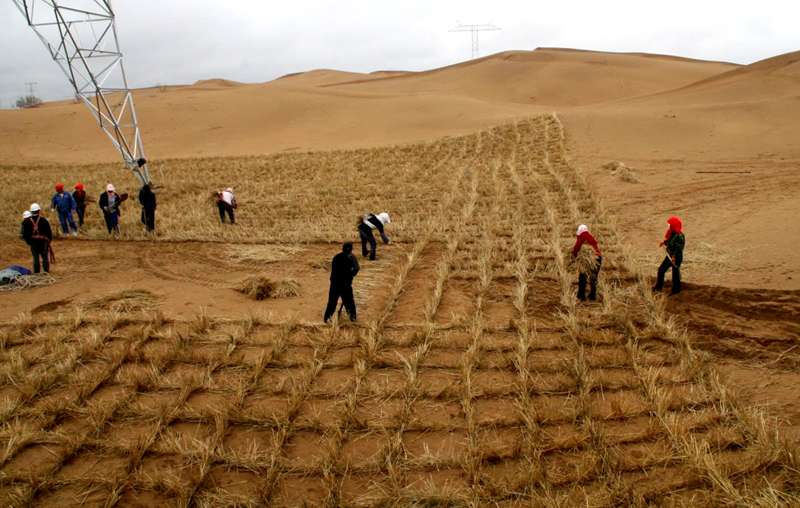 為了解決沙害問題,國網寧夏超高壓公司經過反復試驗,最終采取生物治沙模式固定流沙,然后種植抗旱植物來恢復植被?!?012年起我們就跟沙漠做斗爭。剛開始沒經驗,撒播的草籽、種植的樹苗成活率低。后來,走訪問詢當地林場指導幫助,先用草方格把流動沙丘改造成固定或半固定沙地,再在草方格中栽植白檸條苗,撒播沙蒿等植物的種子,逐步恢復塔下的植被?!卑钻懡榻B。