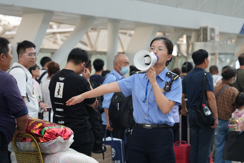 暑運期間銀川火車站工作人員在指引旅客乘車。銀川火車站供圖