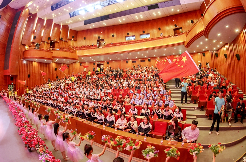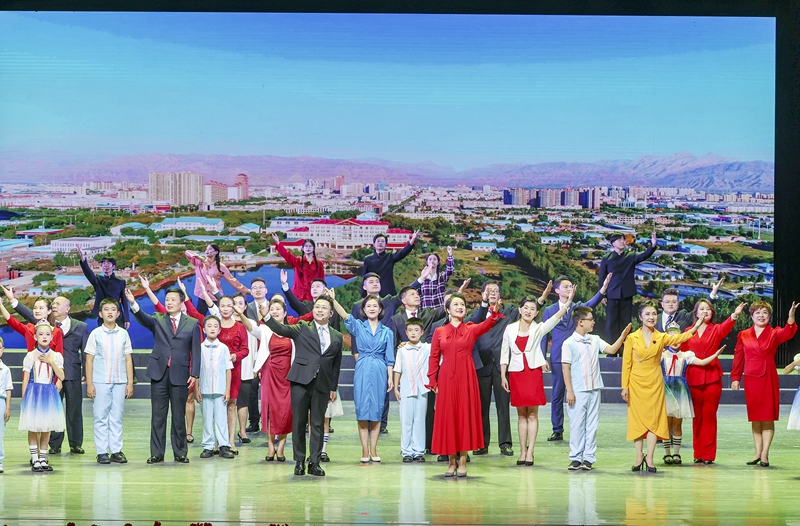 綠皮小火車“石炭井號”、長“眼睛”的礦工帽、發黃的老照片……情景朗誦《在時光隧道中的對話》好像一段電影剪輯,串聯了老中青幼四代人眼中的石嘴山。他們,是從五湖四海奔向沸騰的礦山從地心捧出烏金的父輩開拓者,是“血脈里有股不服輸的勁,守在機房保電發電搶修忙”的“支二代”,是返鄉創業的青年人,是對礦燈充滿好奇的小男孩。他們,是無數石嘴山家庭的縮影。演出尾聲,全體起立,齊聲高唱《歌唱祖國》,嘹亮的旋律響徹演出大廳,掀起了整場展演活動的最高潮。
