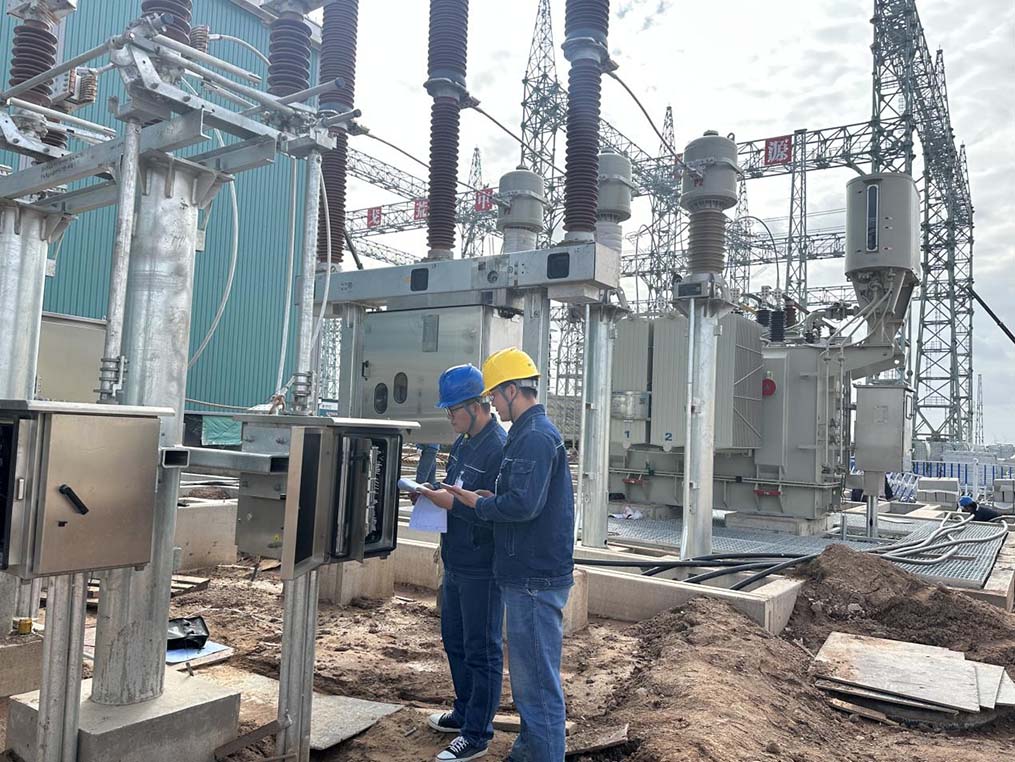 國網寧夏超高壓公司員工對中寧換流站外接站用變設備進行驗收。國網寧夏超高壓公司供圖