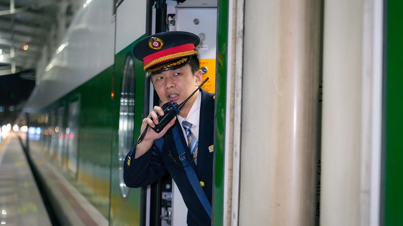 “假期第一天,正值假期出行高峰,咱們要把工作做細致,特別是旅客途中經常使用的設施設備一丁點問題都不能有,大家要仔細檢查……”列車出發前,車長邢國慶一邊仔細檢查車廂設施設備,一邊通過對講機叮囑其他乘務員。