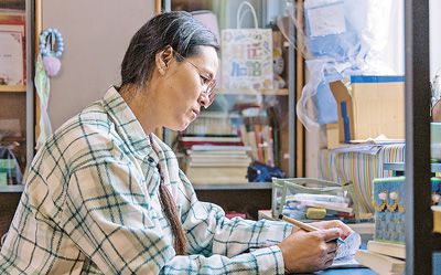 今年46歲的單小花,從事文學創作多年,出版散文集《苔花如米》《櫻桃樹下的思念》,去年成為中國作協會員。圖為單小花在家中寫作。