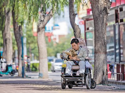 95后作家馬駿是寧夏西吉縣吉強鎮團結村人,他創作的散文集《青白石階》獲第十三屆全國少數民族文學創作駿馬獎。因患脊髓性肌萎縮而依靠輪椅生活的他,常在家門口的大柳樹下看書,筆名取為“柳客行”。圖為馬駿在閱讀。