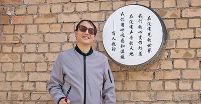 木蘭書院里,趙玲與他的“詩歌輪胎”合影。今年55歲的趙玲是寧夏西吉縣偏城鄉曹垴村人,20多年前罹患腦瘤導致雙目失明,后來學會了用盲文閱讀和寫作,如今經營一家按摩店。