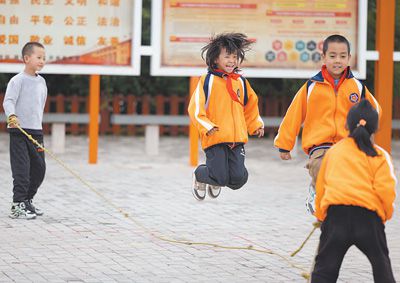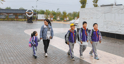 弘德村村口廣場上,家長接剛放學的孩子回家。