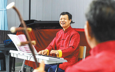 紅寺堡區羅山社區民樂藝術團的老年人在排練節目。
