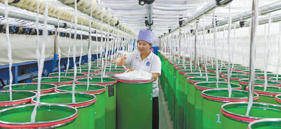 工人在紅寺堡區最大的產業扶貧項目——興民紡織廠的前紡車間內更換條筒。