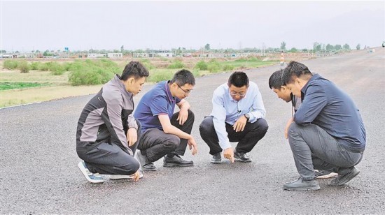 惠迎新(中)在烏瑪高速石嘴山段查看工業固廢用在公路上的效果。 (圖片由受訪者提供)