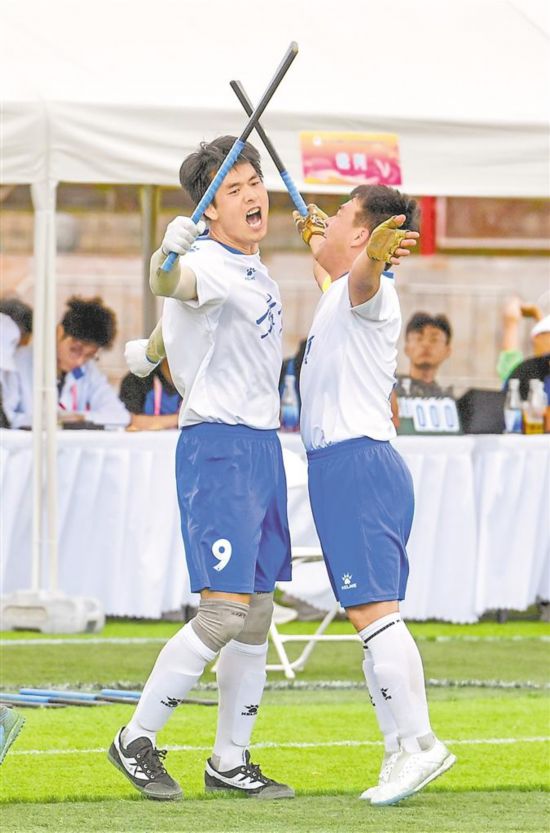 寧夏木球隊老將殷鼎(左)與隊友慶祝進球。 記者 王曉龍 王剛 攝