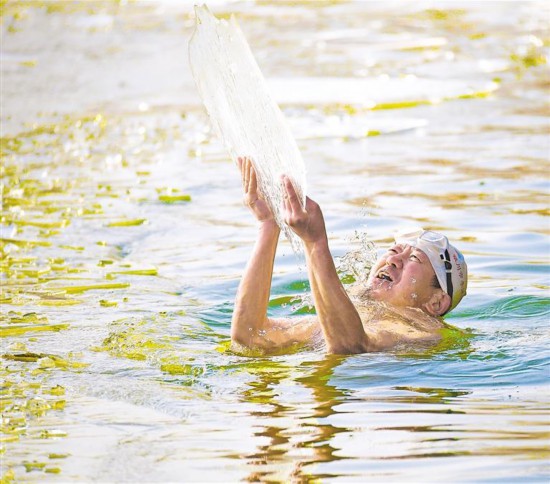 一名冬泳愛好者在水中托起冰塊。 記者 馬楠 王洋 攝