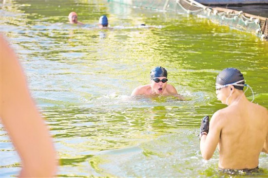 12月19日,銀川市北塔湖,冬泳愛好者在冰冷刺骨的湖水中暢游。寒冬時節,銀川冬泳協會的30余名冬泳愛好者不畏嚴寒在水中暢游,磨煉意志,強身健體。