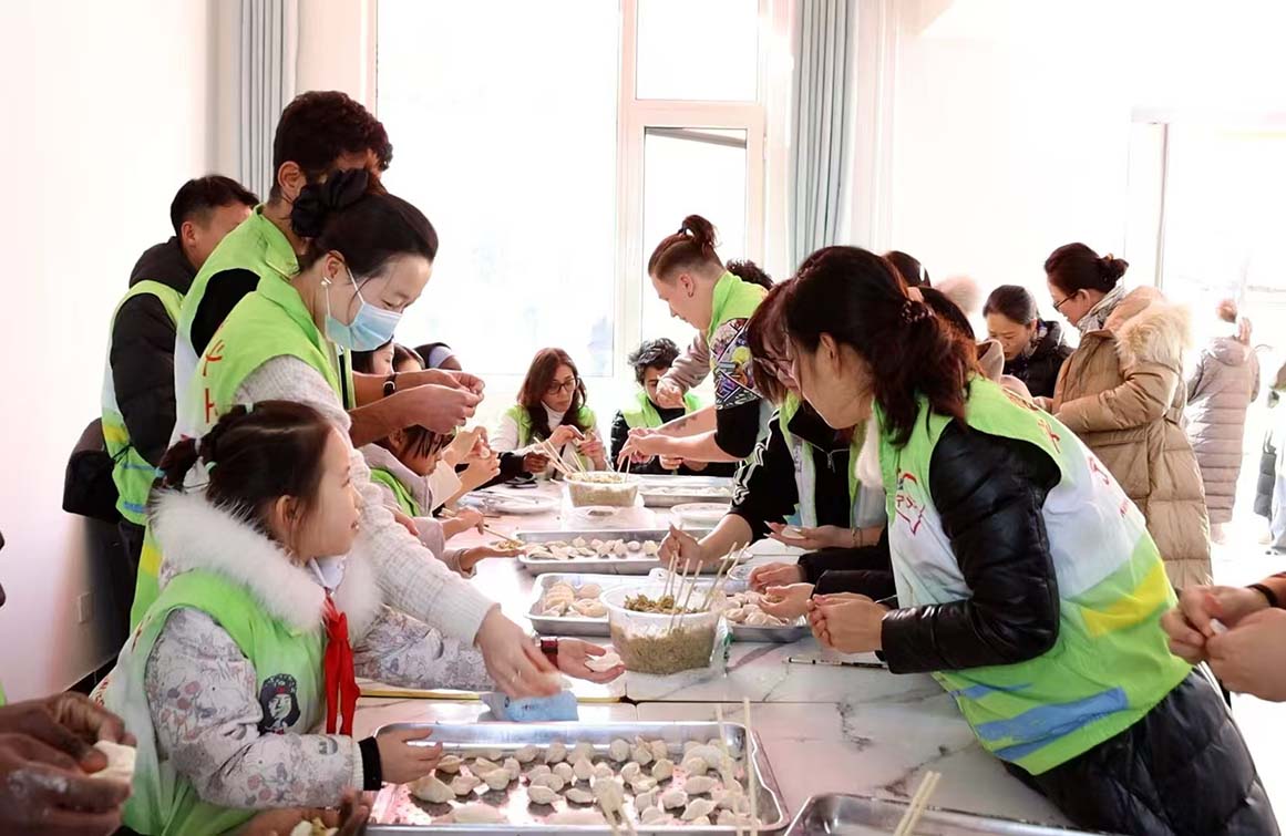 屋外寒氣襲人,室內暖意盎然,學生們在社區工作人員手把手的指導下學習包餃子,熱情高漲,歡聲笑語不斷。當一盤盤形狀各異的餃子越來越多,大學生們和志愿者、社區居民已經在愉悅的交流中打成一片。
