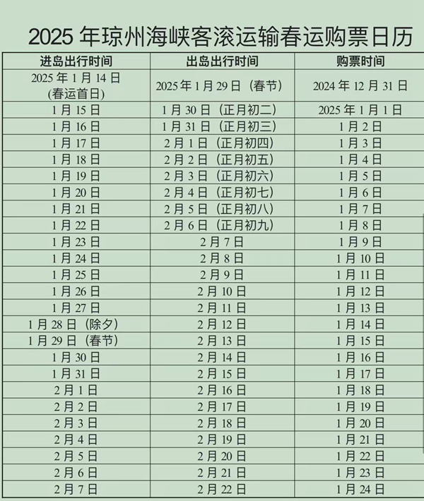 人民網???月3日電(記者 毛雷、孟凡盛)為方便廣大旅客春節期間出行,自2025年1月4日起,旅客可提前購買大年初五(2025年2月2日)出島的船票。以下是有關春運期間瓊州海峽輪渡出行的最新信息: