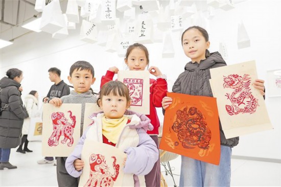 1月4日,小朋友展示自己心儀的版畫作品。當天,由寧夏美術家協會、寧夏美術家協會版畫藝術委員會主辦的“靈蛇舞動·版畫新春”2025蛇年生肖版畫藝術展在賀蘭縣天青美術館舉辦。本次展覽邀請區內版畫藝術家圍繞蛇年生肖主題進行創作,展出作品60余件。記者 馬賽爾 攝