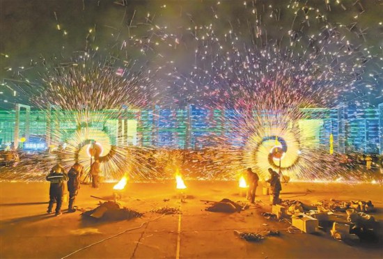 2月1日,在賀蘭縣的寧夏農旅產業園里,精彩的打鐵花表演引來游客圍觀。春節期間,該園區組織了一系列豐富多彩的文旅活動,吸引眾多市民和周邊游客前來游玩。記者 李濤 攝