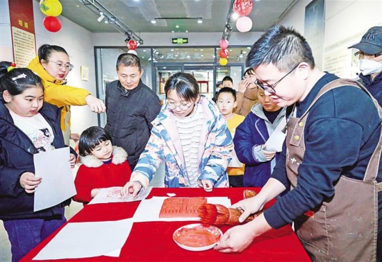 2月9日,參與者體驗雕版印刷、石碑傳拓等傳統技藝。當日,寧夏圖書館策劃組織的“金蛇獻瑞·書香迎春”元宵節系列文化活動啟動。記者 高曉剛 攝