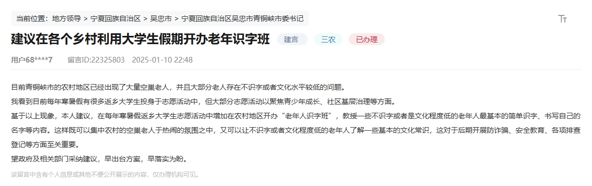 人民網銀川2月12日電(李甜甜)“在寧夏青銅峽市的部分農村地區出現空巢老人,并且大部分老人存在不識字或者文化水平較低的問題?!苯?,寧夏一網友在人民網“領導留言板”上留言,建議在各個鄉村利用大學生寒暑假返鄉,開辦老年識字班。