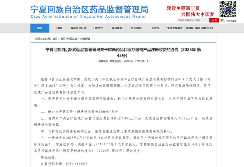 寧夏再次降低藥品和醫療器械產品注冊費 平均降幅超50%