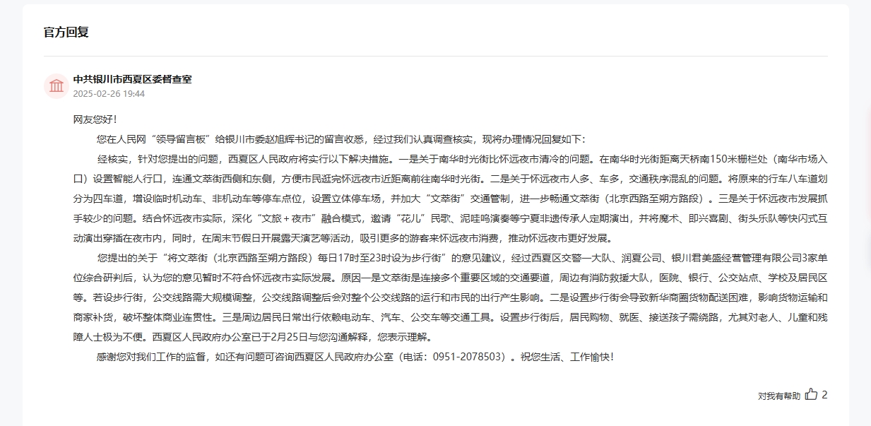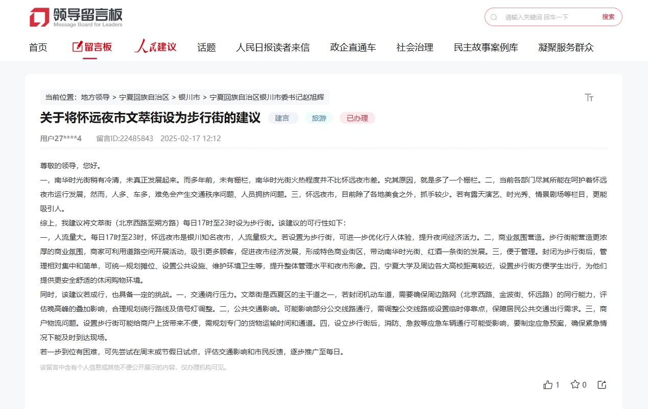 人民網銀川3月1日電 (記者穆國虎)近日,有網友在人民網“領導留言板”上留言,建議將“懷遠夜市文萃街設為步行街”,提出優化懷遠夜市及南華時光街發展的方案。收到留言后,銀川市西夏區人民政府辦公室作出詳細回應,表示優化方案中的部分措施已進入實施階段。