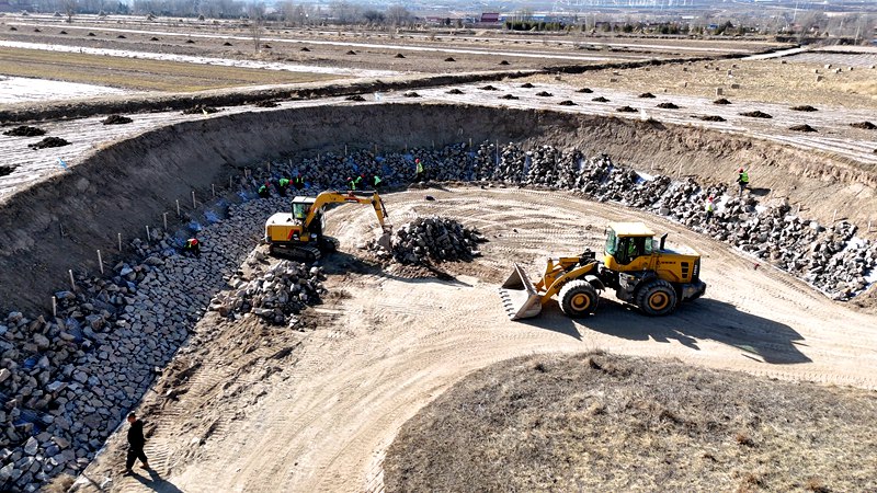 在清水河左岸片區國土綜合整治項目現場,工人們在河道兩側鋪設格賓石,他們使用專業的工具將石頭放置在預定的位置上,原本裸露的泥土被堅固的石層覆蓋,形成了一道防護屏障。