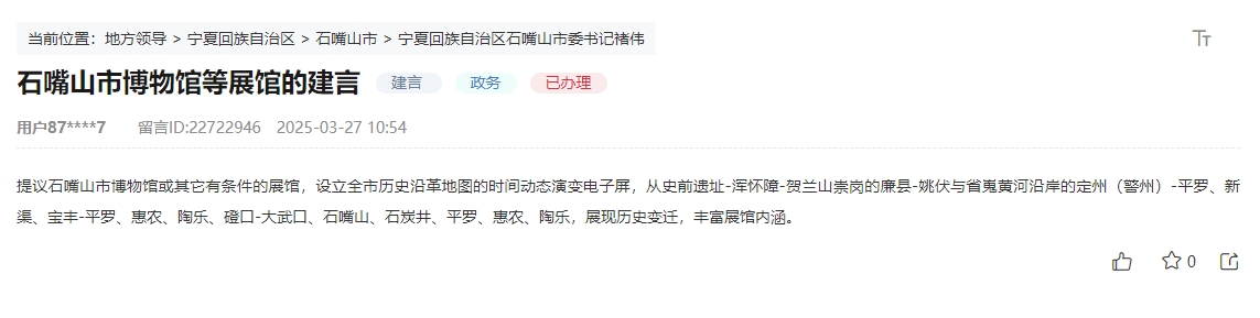 該網友表示,可以從史前遺址——渾懷障——賀蘭山崇崗的廉縣——姚伏與省嵬黃河沿岸的定州(警州)——平羅、新渠、寶豐——平羅、惠農、陶樂、磴口——大武口、石嘴山、石炭井、平羅、惠農、陶樂,展現歷史變遷,豐富展館內涵。