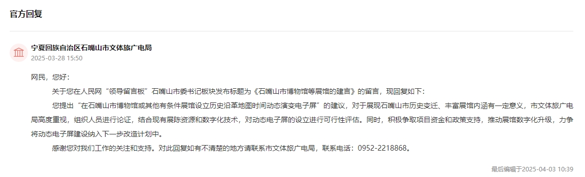 收到留言后,石嘴山市文體旅廣電局作出公開回復?;貜头Q:該建議對于展現石嘴山市歷史變遷、豐富展館內涵有一定意義,石嘴山市文體旅廣電局高度重視,組織人員進行論證,結合現有展陳資源和數字化技術,對動態電子屏的設立進行可行性評估。同時,積極爭取項目資金和政策支持,推動展館數字化升級,力爭將動態電子屏建設納入下一步改造計劃中。