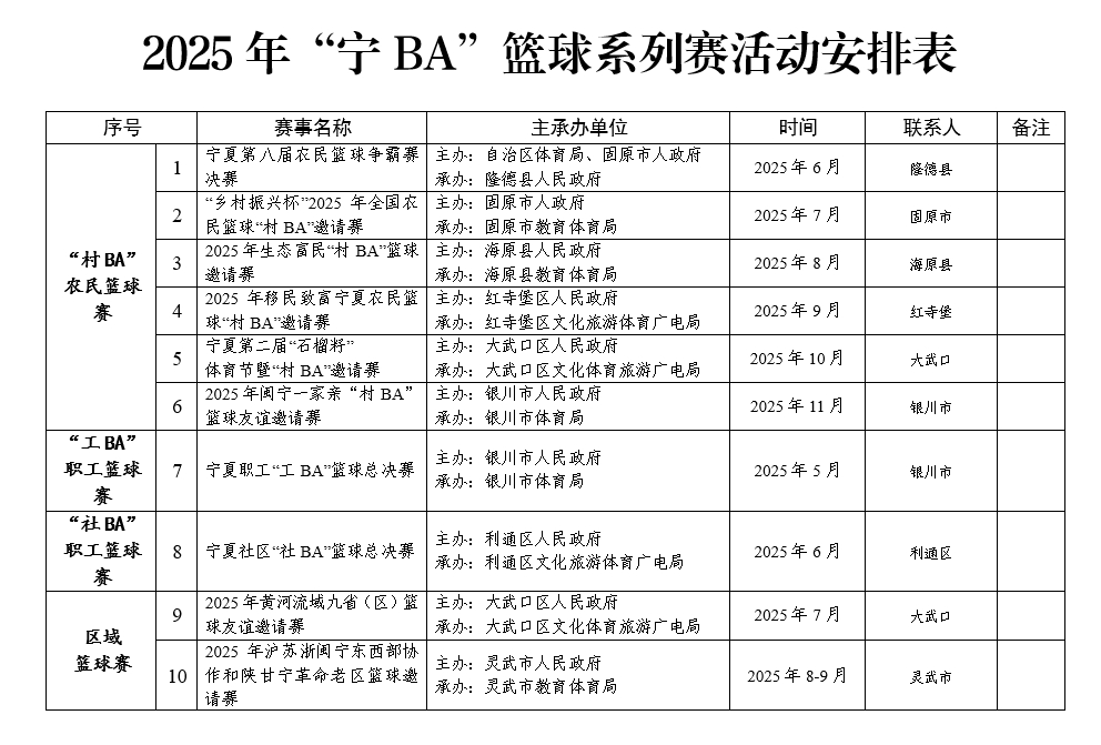 人民網銀川4月11日電(周航)4月11日,2025年寧夏群眾籃球系列賽“寧BA”新聞通氣會在銀川召開。據悉,2025年“寧BA”籃球系列賽包含十項賽事活動,將從5月開始舉辦。