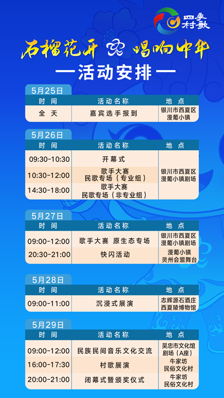 人民網銀川5月21日電 (記者梁宏鑫)第十九屆西部民歌(花兒)歌會暨2025年“四季村歌”示范展示活動將于5月25日-5月30日在寧夏銀川市、吳忠市舉辦。