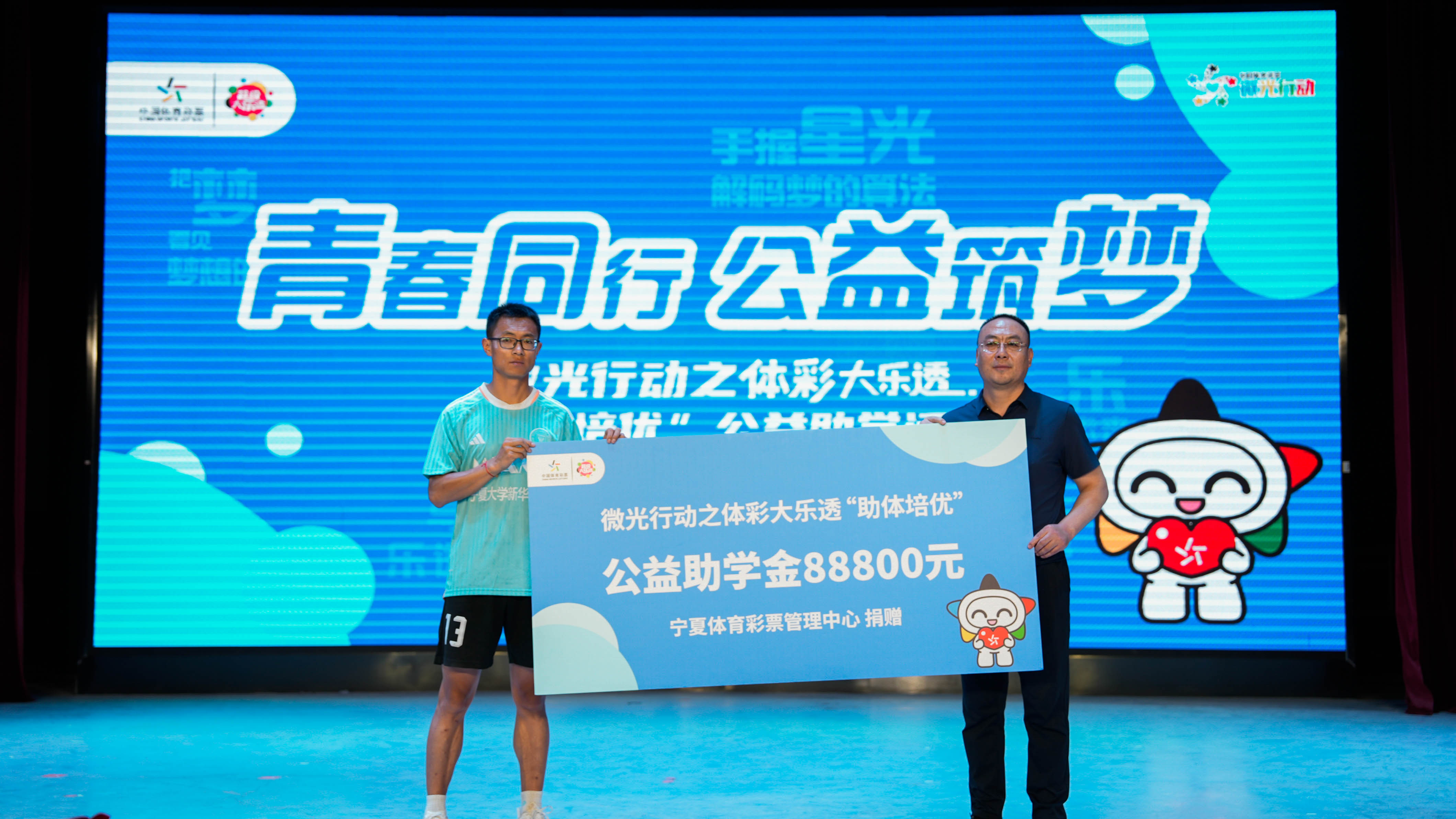 人民網銀川5月22日電 (記者穆國虎)5月21日,主題為“青春同行 公益筑夢”的體彩公益助學活動在寧夏大學新華學院舉辦。寧夏體育彩票管理中心為寧夏大學新華學院社會體育指導與管理專業部分學子送上一份特殊的“成長禮包”——體彩大樂透公益助學金88800元,以點滴微光助力體育學子逐夢。