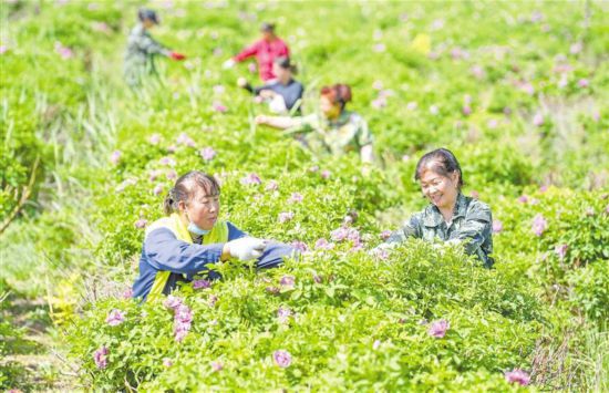 6月2日,石嘴山市惠農區紅果子鎮馬家灣村,村民在采摘玫瑰花蕾。新鮮采摘的玫瑰花蕾與花瓣將被制成玫瑰醬、鮮花餅、玫瑰精油等產品,可提升玫瑰產業附加值。馬家灣村建立“黨支部+合作社+公司+農戶”的產業體系,建成1000畝玫瑰種植基地,帶動季節性用工5000余人次,村民就近務工年人均增收1萬余元。近年來,惠農區依托鄉村特色優勢資源,重點發展農產品加工、鄉村旅游、農村電商等產業,推動“一鄉一業”特色化發展,提高農業綜合效益和農民收入。 記者 王曉龍 攝