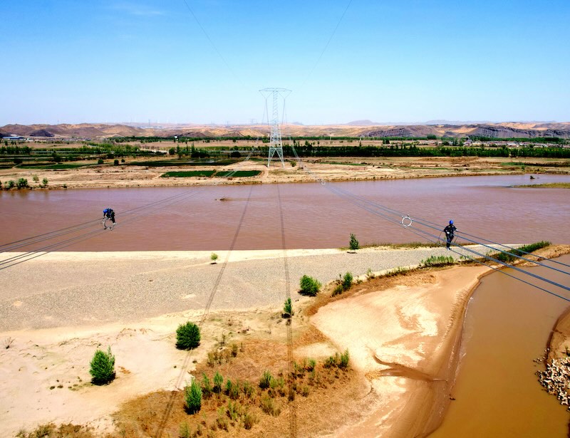 “寧電入湘”工程寧夏段跨黃河驗收。周序鵬攝