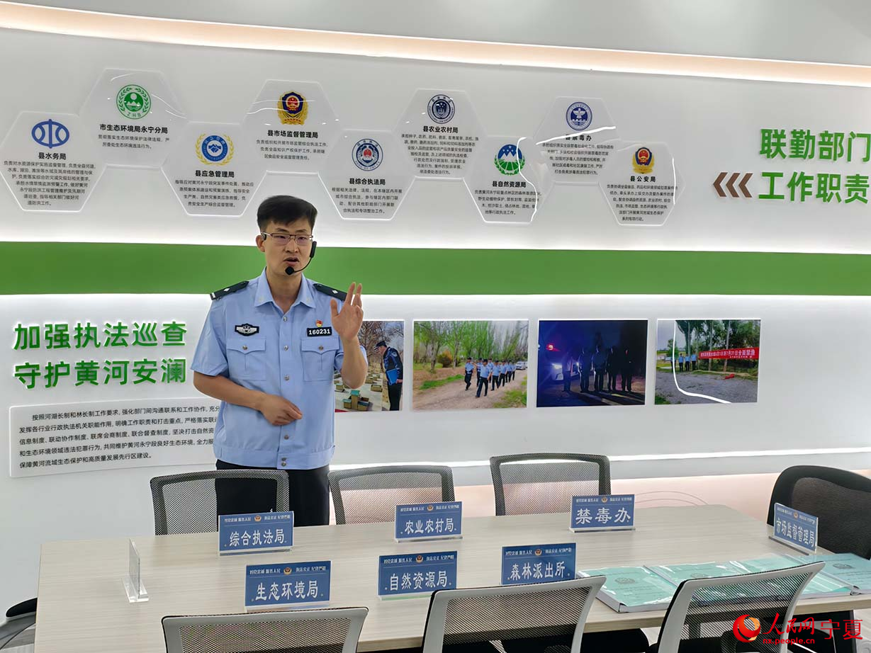 在銀川市永寧縣雷臺生態聯勤警務站,民警梁鵬介紹了該警務站如何建立黃河永寧李俊段巡河護岸義警隊?!傲x警隊成立兩年了,通過這兩年的持續工作,老百姓在保護生態環境意識上有了顯著提升?!绷葫i說。