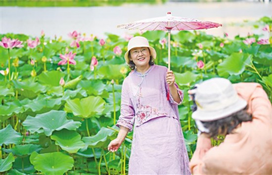 7月9日,市民在荷花池邊拍照留念。入夏以來,銀川市多個湖泊河道荷花次第綻放,成為市民“家門口的風景”。近年來,銀川市接續實施濕地保護與恢復工程,累計投入資金近40億元,連接七子連湖、華雁湖、閱海等10余個重要濕地,修復水系32公里,形成水域面積1700多公頃,新增濕地面積800公頃,恢復濕地植被300多公頃。 記者 馬楠 王洋 攝