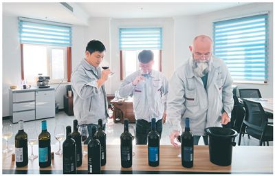觀色、品嘗、思考、對比、記錄……奧利維與同事全神貫注,不放過任何細節。經過反復斟酌與討論,他們終于對三款葡萄酒的配比達成了一致。