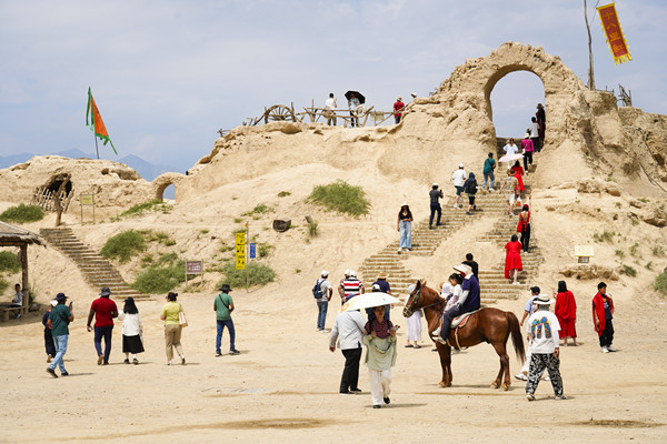 7月22日,游客在銀川市鎮北堡西部影城月亮門景點前打卡拍照。西夏陵申遺成功,帶動了賀蘭山沿線各旅游景點人氣,“歷史+影視+生態”的多維魅力,吸引著來自四面八方的游客。見習記者 喬新宇 攝