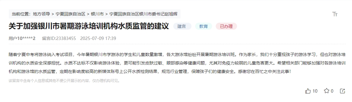 該網友在留言中表示,隨著寧夏中考將游泳納入考試項目,各大游泳館紛紛開展暑期游泳培訓班。作為家長,對游泳培訓機構的水質安全深感擔憂。水質不達標不僅影響游泳體驗,更可能引發皮膚過敏、眼部感染等健康問題,尤其對免疫力弱的兒童危害更大。希望相關部門能夠加強對各游泳培訓機構和游泳館的水質監管,定期在媒體上公開水質檢測結果。
