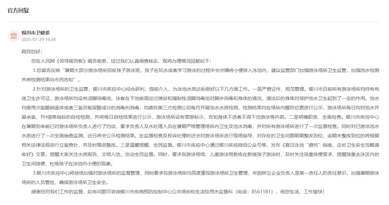 收到留言后,銀川市衛健委公開回復:銀川市目前所有游泳場所均持有有效衛生許可證,游泳場所均設有浸腳消毒池,泳客在下池前需經過淋浴和強制性浸腳消毒池對腳步消毒和身體的清潔,清潔后的身體對保護游泳池水衛生起到了一定的作用。池水均使用次氯酸鈉液體或者三氯異氰尿酸成分的消毒劑消毒,均委托第三方檢測公司每月開展水質檢測,檢測結果均在場所內醒目位置進行公示,游泳場所每日對池水開展余氯、PH值等指標的自檢檢測,并將每日自檢結果進行公示,游泳場所設有禁游標示,告知身體不適者不得下池游泳等內容。