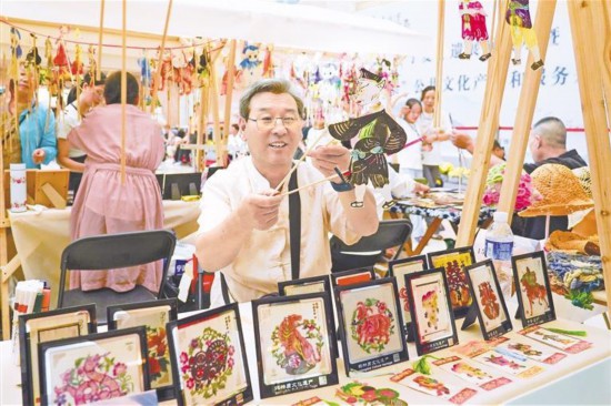8月7日至10日,“塞上非遺 匠心傳承”寧夏非遺展演展示暨“趕大集”公共文化產品和服務采購大會在寧夏博物館舉行?,F場,“趕大集”文創展銷區成為熱點。圖為非物質文化遺產代表性傳承人向市民和游客展示皮影作品。 見習記者 喬新宇 實習生 姜岳岐 攝