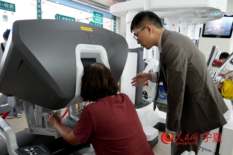 市民正在進行手術機器人“試駕”。人民網記者 梁宏鑫攝