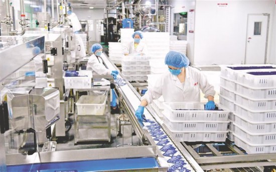 8月21日,璽贊莊園枸杞有限公司工人在灌裝車間打包枸杞原漿。